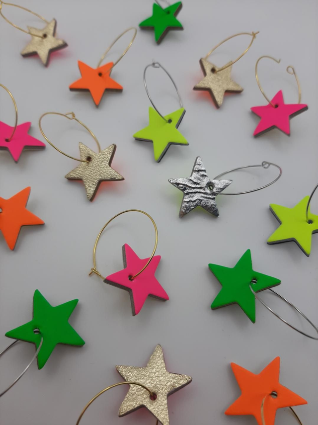 Introducing our handmade reversible hoop earrings crafted from reclaimed leather, featuring a simple, yet stylish star design. These unique earrings offer a versatile look - with neon pink on the front and metallic leather on the reverse. Choose from either gold-plated or rhodium-plated (silver) hoops. Wear as a matching pair - or not! Stand out with a pop of colour and sustainable fashion with these eye-catching earrings. Dimensions: hoops are 2.5cm in diameter. Star motifs are approximately 2.5cm x 2.5cm.