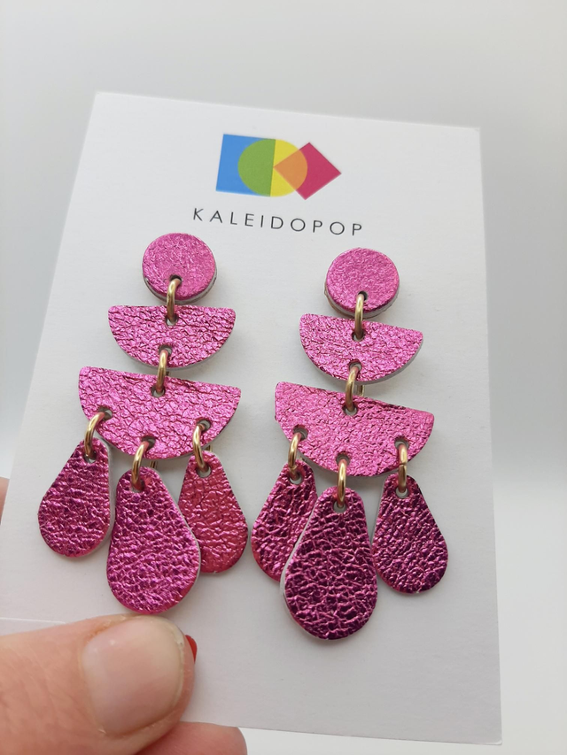Handmade from reclaimed leather, these chandelier style earrings are made from metallic purple leather and backed with metallic gold leather on the reverse. Measuring approximately 6cm in length, these earrings are lightweight and comfortable to wear all day. Complete with surgical steel pins, these earrings are perfect for those with sensitive ears.