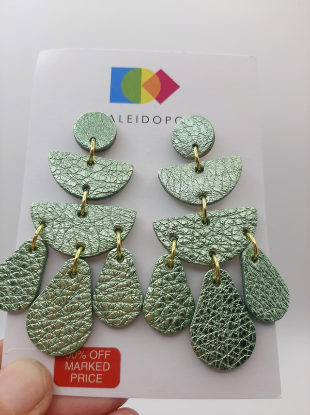 Make a statement with these extra large chandelier style earrings in metallic pistachio green leather. Handmade from reclaimed leather. Attached to surgical steel fixings. Length: 7.5cm approx.