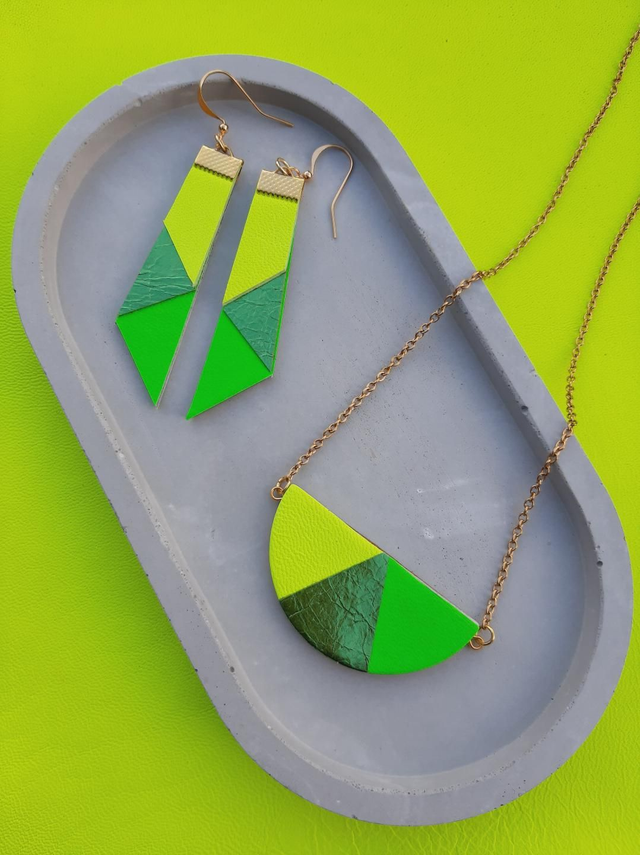 One for all you neon lovers! This semi-circular pendant features leathers in the loudest shades of acid yellow and lime green, with a segment of gorgeous metallic apple green leather in the centre. Lovingly handmade from reclaimed leather. Attached to a fine gold-plated chain with lobster clasp. Dimensions: pendant is 5cm w x 2.5cm h. Length of chain - 18 inch / 45cm. Please allow up to 7 days for delivery.