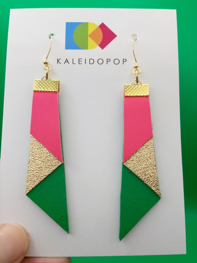 Introducing our stunning leather earrings with a unique trapezoid shape. Featuring a lush colour palette of pink, gold and green. Handmade from reclaimed leather. Attached to gold-plated fixings. Dimensions - leather motif is 6cm long, total length of earring inc. fixings is 8cm. Please allow up to 7 days for delivery.